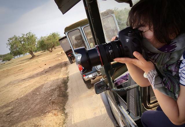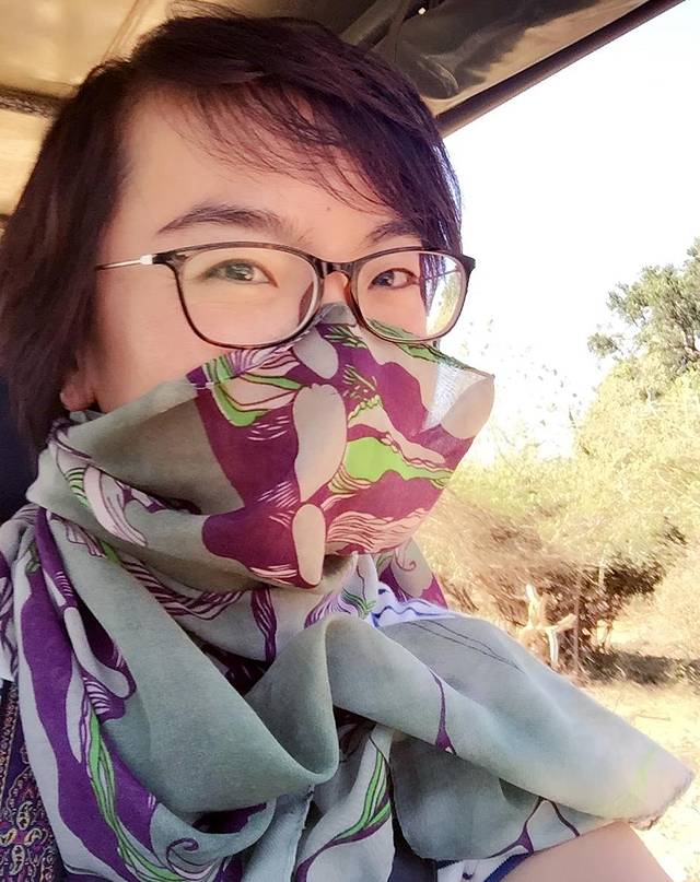 全团18人一共乘坐4辆越野吉普车,有顶棚没窗户那种。公园里都是土路,所以开起车来有很多尘土,可以戴口罩或者围个纱巾,要不真的会满嘴沙子。一开始我还戴着帽子,后来太热摘了,一开始我还没围纱巾,后来真不行捂上了,一开始我还端着相机,后来只要没动物的时候都用纱巾包着镜头。。。