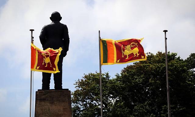 斯里兰卡的国旗,左边框内是绿色和橙色的两个竖长方形;右侧为咖啡色长方形,中间是一头紧握战刀的黄色狮子,长方形的四角各有一片菩提树叶。