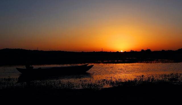 刚入住的时候,太阳马上落实,我抄起相机跑到酒店院子里的小溪边,碰巧还有一艘船开过,美!