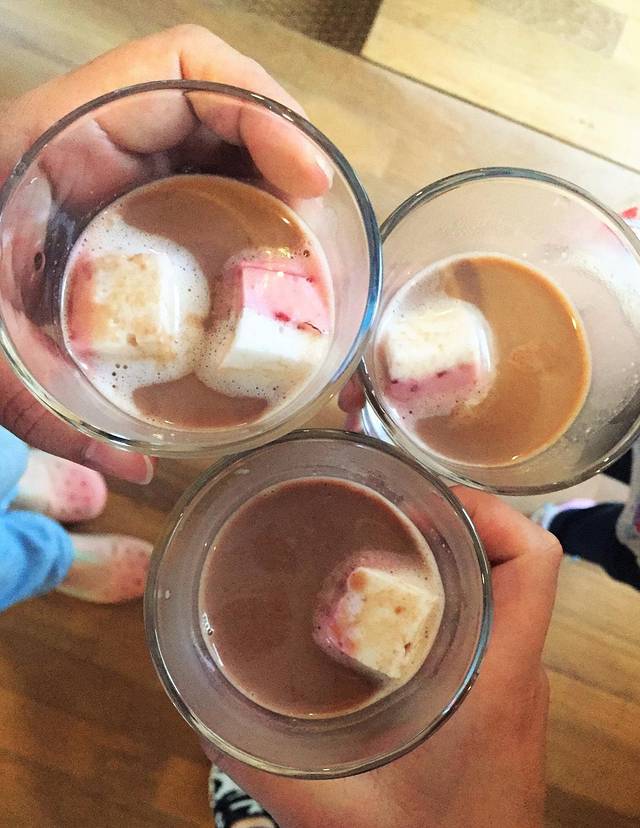 下午五点多,到地儿之后,果然很凉爽!当地人都有穿棉衣的呢!我觉得套个外套就差不多了。出了火车站又坐上大巴,直奔酒店了。冷的地方连酒店的迎宾饮料都不同了,其他酒店大都是冰镇橙汁等,这家酒店给的是热可可配棉花糖!