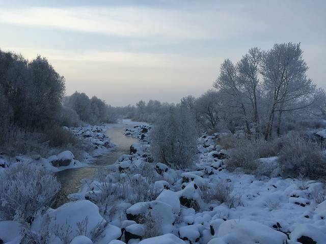 异乡的清晨总是起的很早,但日头早已被埋在雾中,不期而至的雾凇来了,所有人都兴奋的起床,早餐后赶紧沿药泉路去欣赏雾凇,一条横穿药泉路永不结冰的石龙河缓缓地流淌着,一缕缕水汽从河面飘向人间,几个衣着艳丽的人,走在木制栈道上,此情此景也是醉了。