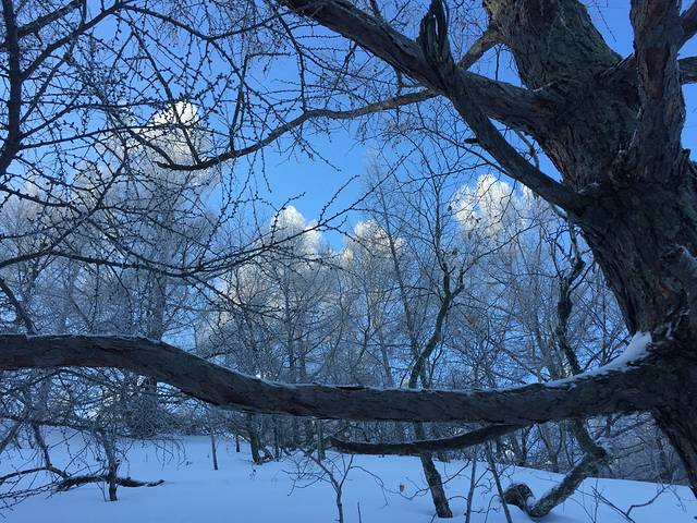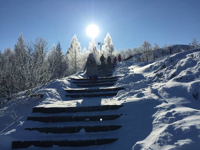 太阳压过云层,崭露头角的时刻,老黑山火山口顶部的树梢挂满了冰晶,迎光而望,树生冰晶,冰生光影,好一幅北国山水画卷,有光有影的时刻便是朋友们起兴的时刻。