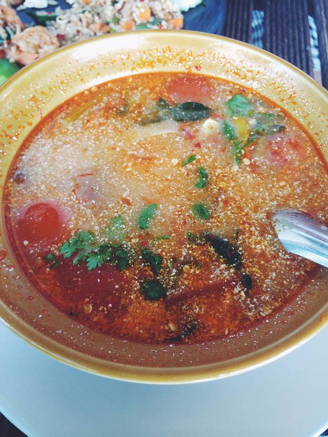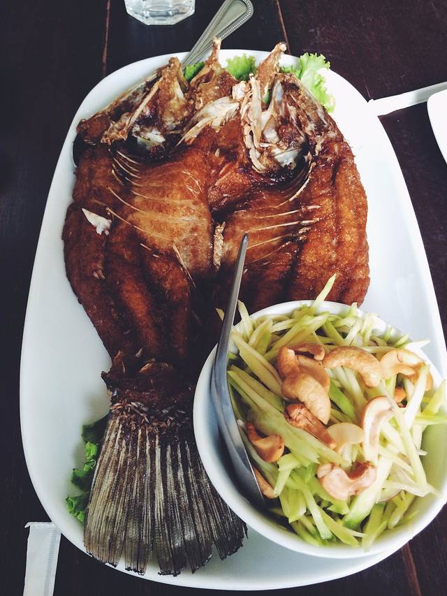 这家的烤鱼真的非常非常棒,是我们整个旅程中吃到的最好吃的烤鱼。泰国菜非常讲究酱汁的调配,这个鱼烤得酥脆,加上青瓜酸汁酱,可口开胃,无与伦比得一种美味