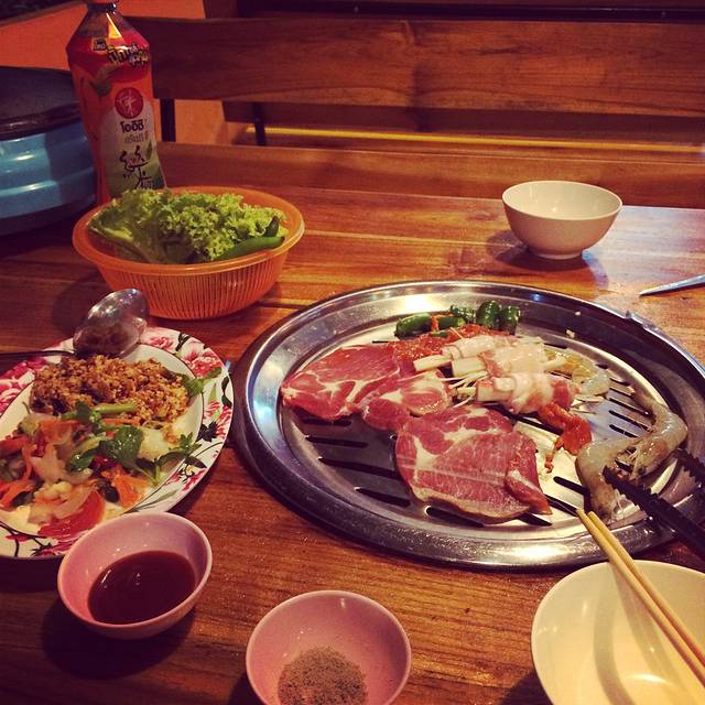来接我们的是提前和酒店预定好的接机TAXI(700THB),司机人很好,开车稳稳当当的,他跟我们说在我们来之前这里连续下了一个礼拜的雨,看我们后面的运气会怎么样了。是的,泰国的雨季就是这样,运气不好会碰上连绵大雨,运气好雨下一会就没有了。这是我们在泰国吃的第一顿晚餐,不贵,199THB一个人,是一个自助BBQ和小火锅。饥肠辘辘的我们开始大快朵颐了,这里的自助真的可以是大块朵颐,不管是五花肉还是牛肉都足足有2-5厘米厚,吃几个我们都已经撑得不行了。不仅仅是这个印象深刻,更深刻的是这个店里的伙计都不会英语,于是我们全程都用了肢体语言交流,现在想想都觉得好玩