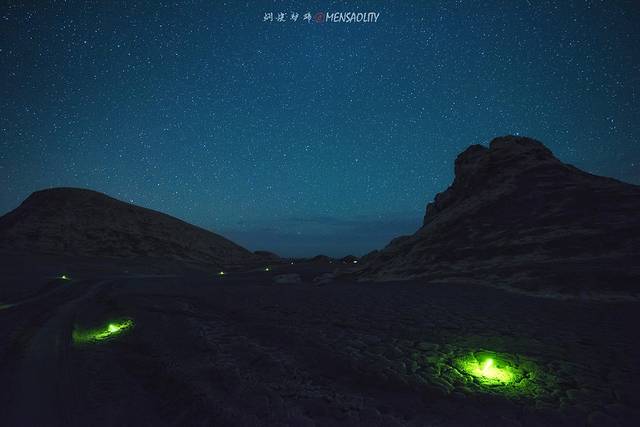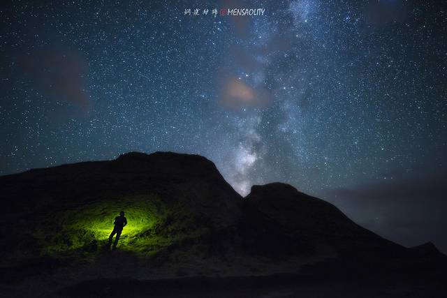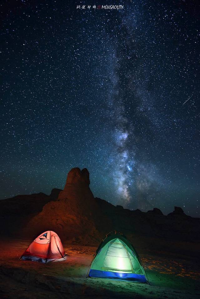 晚饭没吃好,估计是陷车后精神有点恍惚吧,厨子居然把一整包火锅底料当做调料放进了一锅面条和白菜里,辣得无法下嘴,于是将就着吃了点干粮,啃了几口悠悠姐带来了盐水鸭,味道不错。体力稍微恢复了下,就拿起摄影包三脚架出发去拍星空了,当然少不了带荧光棒,不敢走远,就在方圆500米范围内吧。