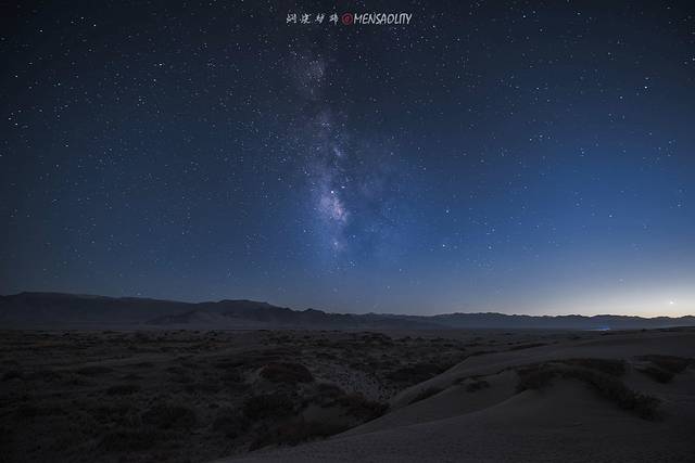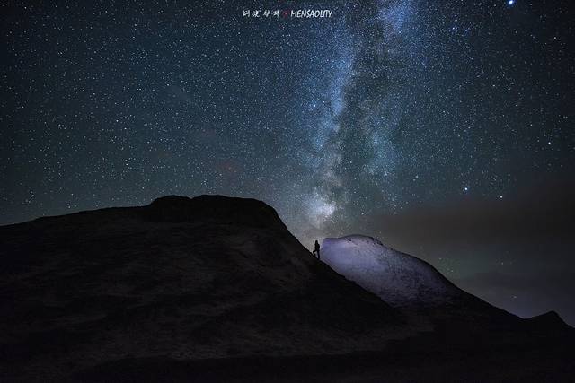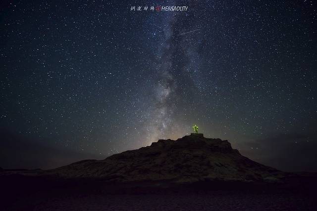 9月底,太阳刚刚落山,银河就已经竖立在天空的西南方了,而且农历月底上半月无月亮,对于这些我都已经烂熟于心。而这个时间,晚上10点多,银河逐渐西斜。昨天的大柴旦湖还有不少的光害,而这里几乎就没有了,看着银河在地平线上就已经那么清晰,我拖车的劳累似乎一扫而空,自告奋勇爬上了一个挺陡峭的雅丹,在上面各种装逼。