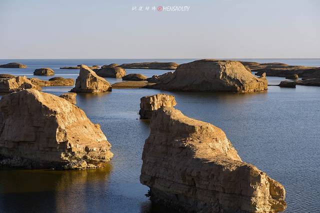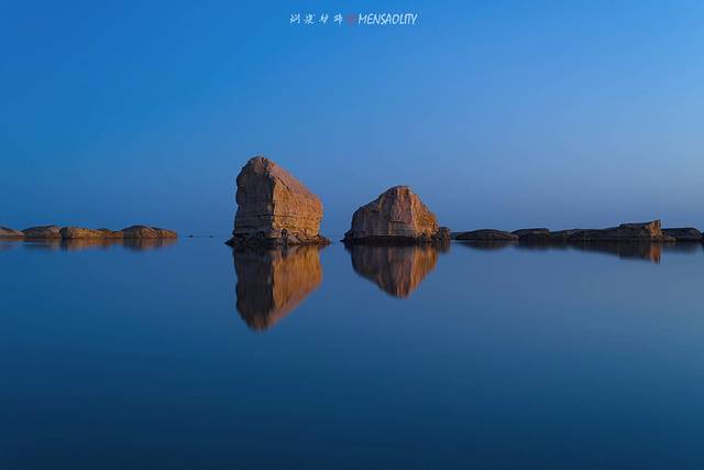 日落时分,原本土黄色的水中雅丹被夕阳染成橙红色,而湖水也随着天色变成了深蓝,对比很强烈,仅有微风,水面如镜面一样平静。