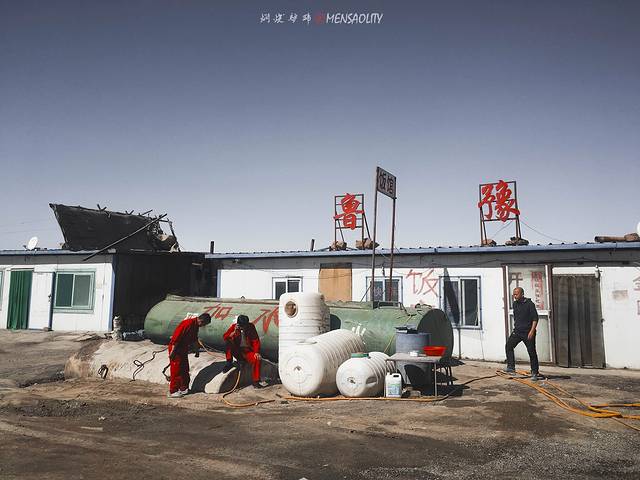 门口很小,钻进去,稍显阴暗和杂乱,两桌人正在喝酒聊天,看起来不是矿场工人就是卡车司机,粗犷而豪放。老板娘很魁梧,抱着娃迎接我们,挺热情的。等菜聊天时,我们知道他们来自格尔木,这里的商品、食物甚至水也来自格尔木,要在格尔木买了水票,需要送水,大水罐车就开过来了。