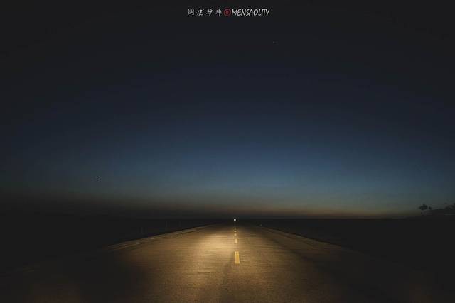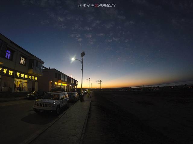 黑夜降临后,刚才一切都那么遥远的东西显得更虚无缥缈了,偶尔看到路的尽头有车灯,亮了好久好久,都没到眼前。沿着公路开呀开,终于看到了远处地平线的一排灯光,那就是冷湖镇了。