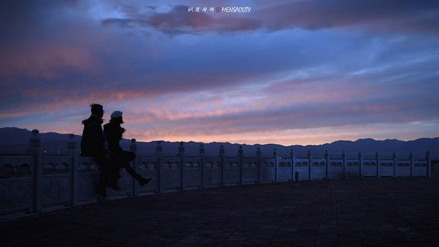 到达茶卡盐湖的时候,已经是6点多,下车之后感到一阵阵寒意,就在停车场加衣服,由于行李太多,换得稍慢,锁上车门时,看着天边的一线昏黄,就知道太阳已经下山。我们也就不急了,慢慢走过修建得很宏大的广场,留了张纪念照,突然看到西边的云底发红,一下子就意识到,这是火烧云的前兆!马上一路小跑往湖边赶,我问大象哥,到达湖边有多远,大象气喘吁吁说还有几公里呢!我说那不得跑上10分钟?10分钟火烧云就没了。火烧云好看,但没有合适的前景,也构不成一张漂亮的片子,所以我们还是要赶到湖边。跑一段,停一下,看着天边的火烧云慢慢旺起来,又慢慢暗淡下去,真后悔刚才穿衣服花多了时间。