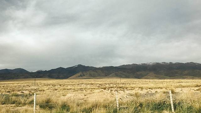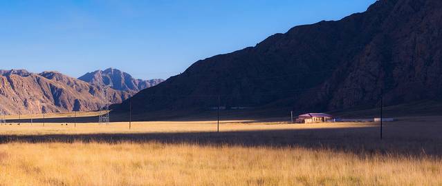 公路笔直而孤独,偶尔会看到路边突兀地立着一个孤零零的大门,没有围墙,没有栅栏,只看到门后一条孤零零的土路延伸到远方,大门上都是某某矿场之类的。看不到汽车人员出入,但见远方地平线上滚动着一条黄色的带子,应该是矿车扬起的尘土。
