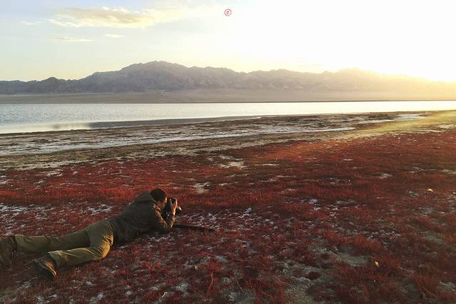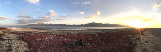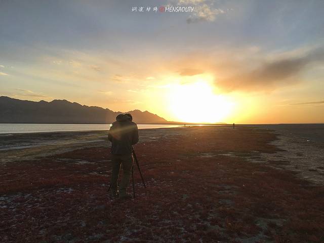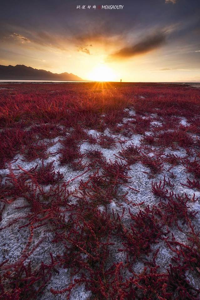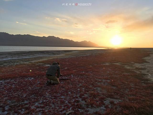 刚才还是盐碱地一样的地面,到了湖边就长出了红色的草,很低矮,但是在阳光照耀下颜色非常漂亮,和蓝色的湖水形成了强烈对比。