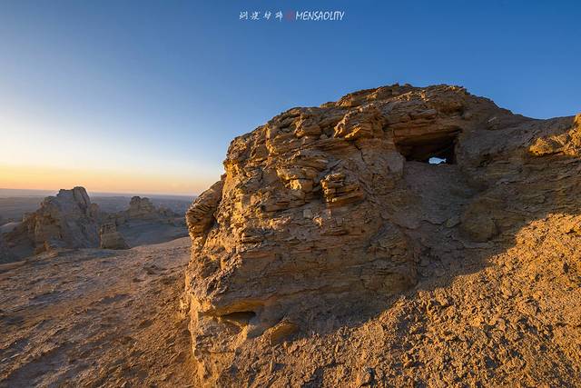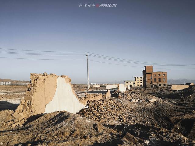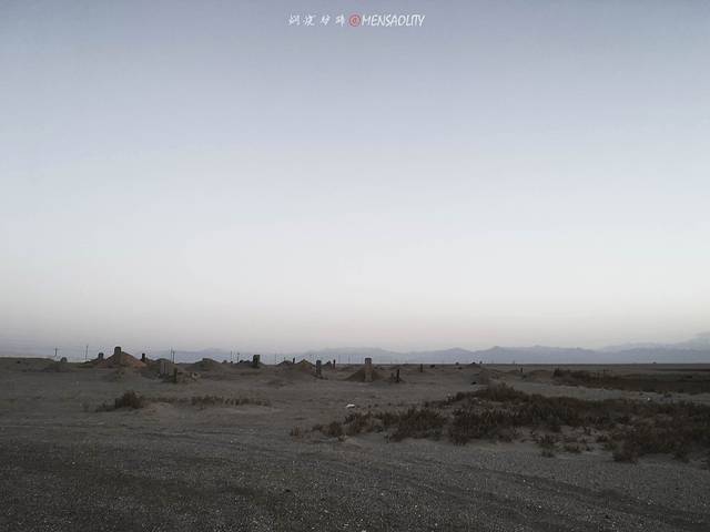 西边,是望不到头的沙漠,逆光下更是显得无比苍凉。北边,是雪山,我没猜错的话,应该是阿尔金山山脉,在斜阳下显出了一些立体感,看着不远,但别忘了“望山跑死马”;东边,大概十几公里外的“近处”也耸立着山脉,往东边一直延伸,一直看不到头,顺着这个山脉过去,应该就是我们要去的苏干湖;后面的冷湖镇的建筑慢慢的变成了一条水平线。开出来十几公里后,我们惊奇的发现公路左边有一大片荒废的低矮建筑群,面积至少有500米乘500米,基本全没了顶,只剩下光秃秃黄色的墙,没有任何生命迹象。我第一感觉是,哇,这里可以拍片子,但又转念想到,正因为这里以前有很多人,现在空无一人,所以显得还挺诡异的,比南八仙魔鬼城诡异多了。