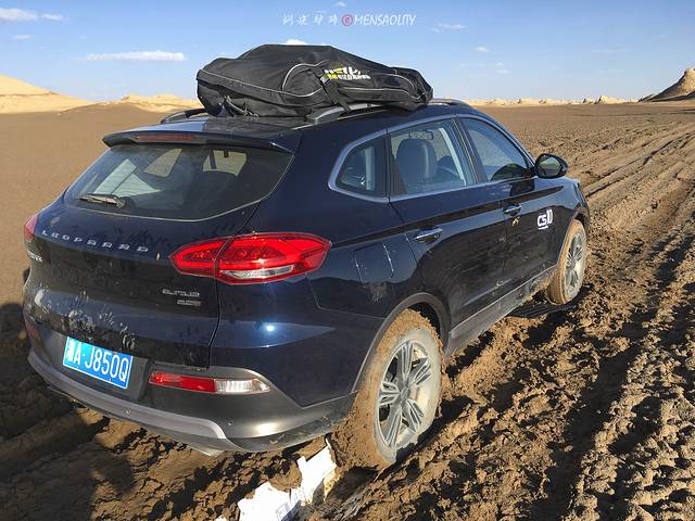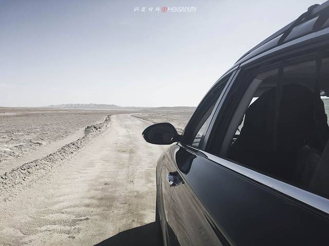 大象哥和悠悠姐作为尖兵,在我折腾无人机的时候,爬上较高的雅丹,望到了远处有一片小小的盐湖,而且有硬质土路可达,于是我们打算开车过去。一开始确实都是硬质土路,而且沿路都有路牌指示,后来,发现路面开始有点反光,我猜应该是路面有点水分,但我没有多想,就继续往前开,后发现车身开始打滑,我菊花一紧“不妙!”,担心的事情还是发生了,打滑变得严重,最后车完全不动了。