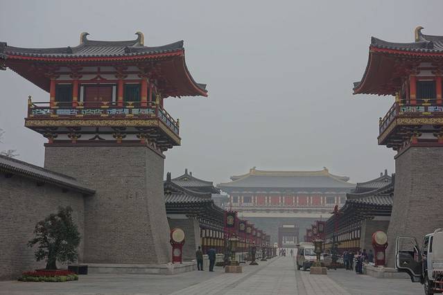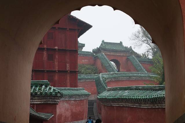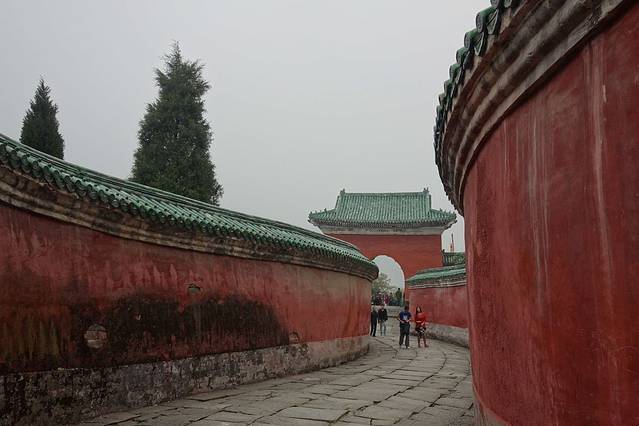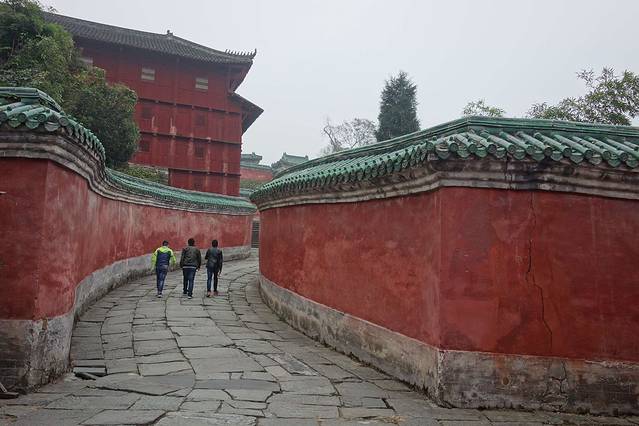 走进复真观的山门,看到在古道上依山势起伏建有71米长的红色夹墙,这就是九曲黄河墙。