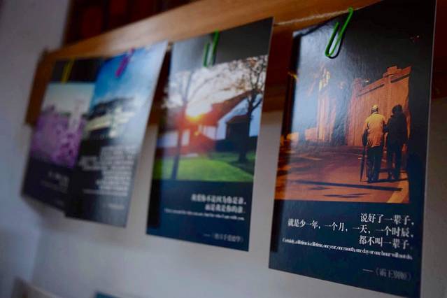 应朋友相邀,于是有了合肥行,第一天入住的是朋友带过去的一家青旅——叶子和她的朋友们。第一次听到这个名字的时候,还以为是一位叫叶子的姑娘写下的句子而已,后来才知道,原来是这家青旅的名字,纯朴,自然的句子,居然作为了青旅的名字,而且表达的意思居然还这么直接,意义也表达得如此恰到好处,亲近,一下子拉近了距离。那时,还在想,到底是怎样的一位姑娘,有这样的情怀,直到我去了那里。旅舍离市中心不远,却处于一个比较老旧的城区,屋子外面有一小块地,叶子拿来种了菜,真是个会过日子的姑娘,院子里种满了花草,虽然不大,但布置得井井有条的,两张竹编的椅子,一张桌子,平日里大家可以在上面一起吃饭,屋子的墙壁上留着在这住过的人的痕迹,满满的明信片记录着所有人的回忆。。。