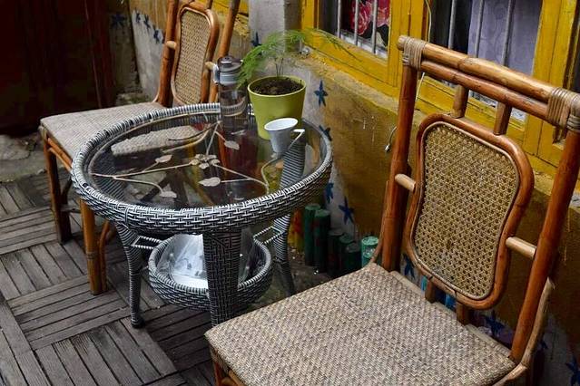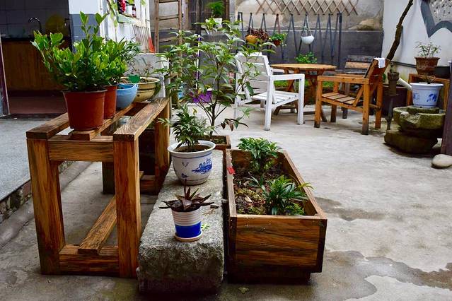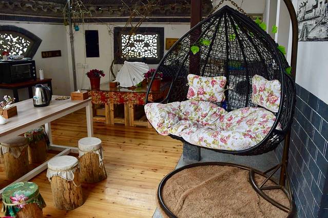 宏村里的客栈有很多,去之前也是对比了很多才定了这家——天涯客栈,从位置,从价位,从评价。记得那天,八点多到达景区,不知道往哪走,打电话给老板,老板很好,出来接我,帮我提行李,是一位年纪和我差不多大的小伙子,客栈离景区门口走路五分钟左右就可以到达,还是很近的。一进门,感觉就很好,客栈里面的两位小伙伴主动和我打了招呼,院子里种满了花草,布置得也很文艺,一席沙发,一个吊椅,一张桌子,几个凳子,是我喜欢的感觉。。。