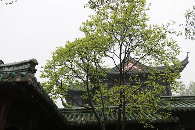 典型的瘦西湖景观,倒影,河堤,黑白翘脚建筑。以及,绿色的烟雨。