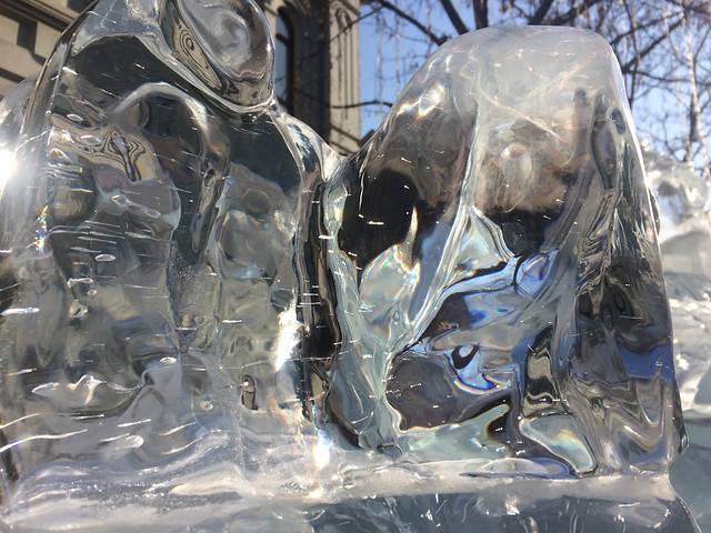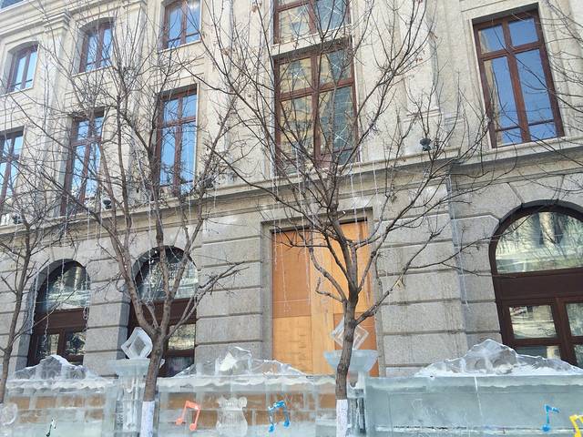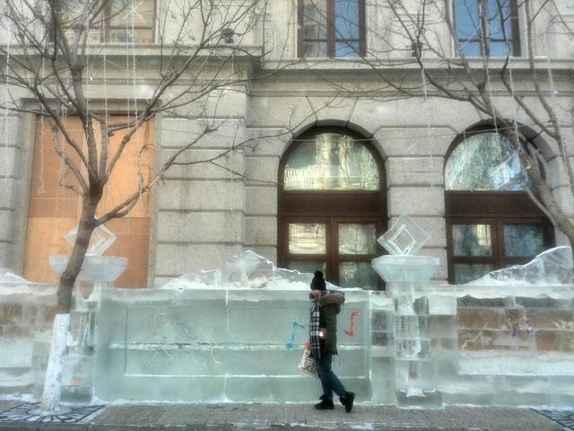然后从圣索菲亚走到中央大街,路上有冰的地方一定小心滑倒啊。中央大街上真的一步一个冰雕!晶莹透亮特别美丽,两个南方姑娘表示很是兴奋。