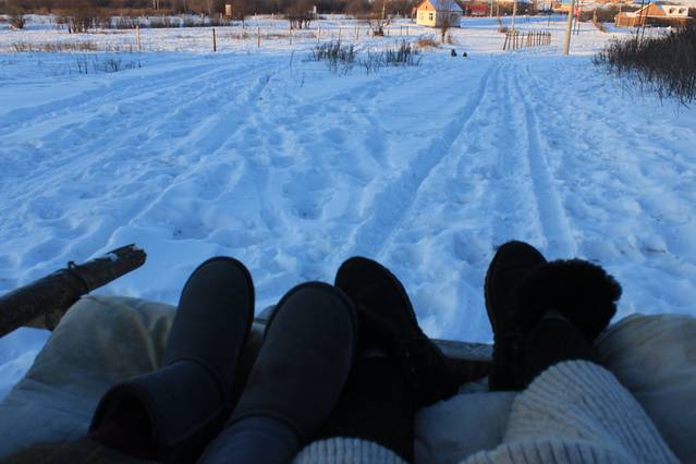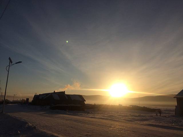 回屋暖和暖和叔叔就带我们坐马拉爬犁上山看日落!