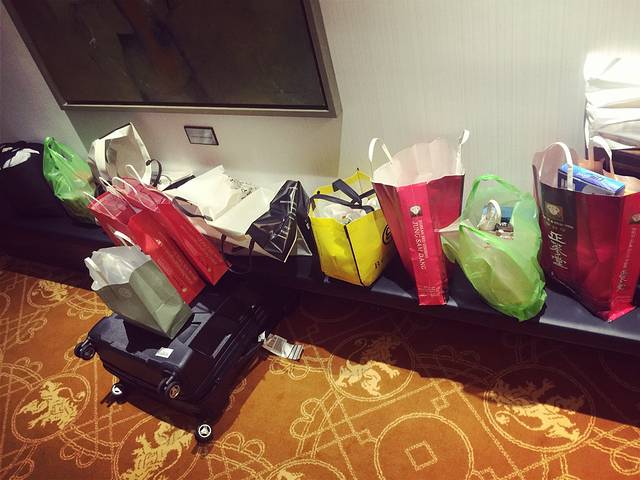 ↓下面有图是酒店房间最特别的地方。一进门左手边会有一条很长的木条,上面有皮垫,类似凳子但比一般凳子矮很多。我们一开始不懂这地方有什么用处。几天下来,发现这条长条就是放战利品的好地方啊!房间窄,把购物的东西都放这,一目了然,棒棒哒。下面的图是我们前两天的成果而已....