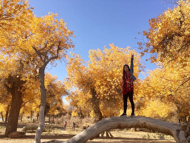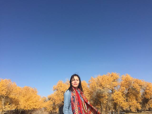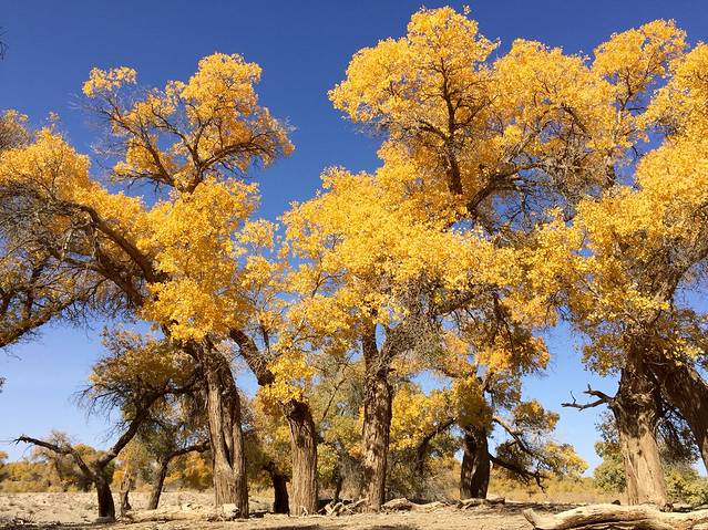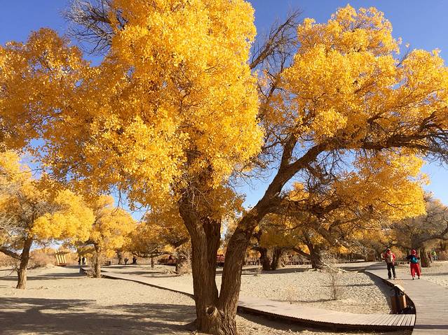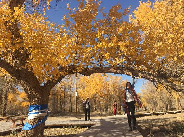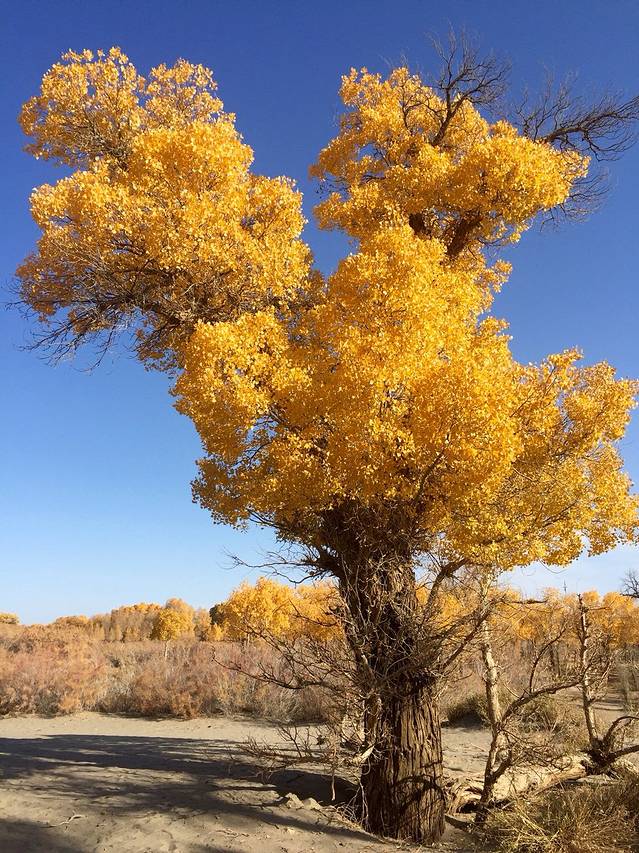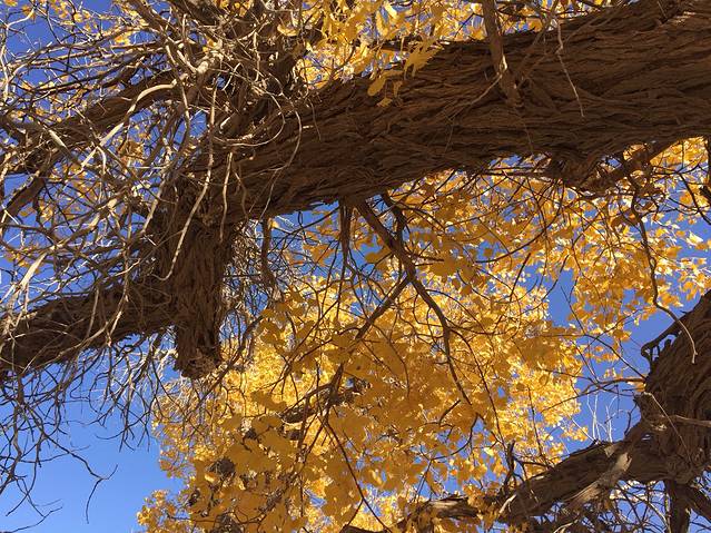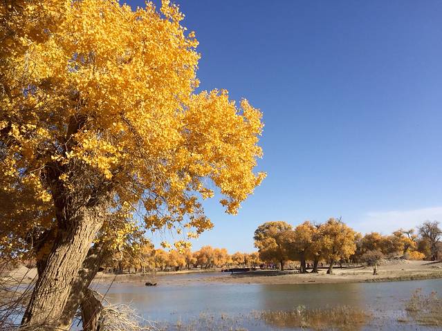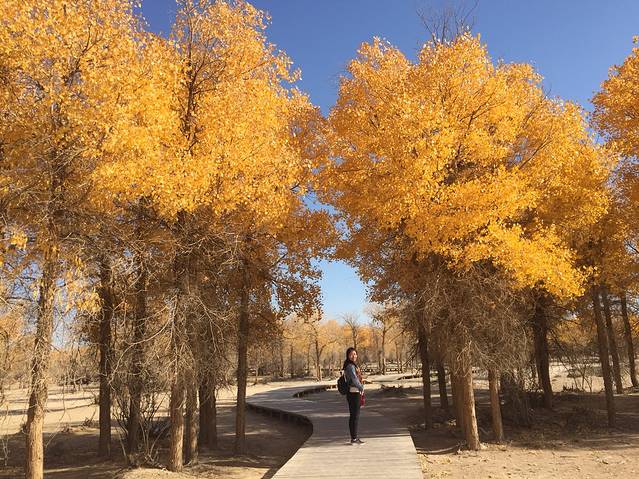 一进入景区,就被深深地震撼了,从未见过的景色在眼前铺开,天空蓝的纯净,树叶黄的耀眼,颜色搭配的相得益彰,恰到好处,胡杨树展示了强劲的生命力,有一种矛盾的美感!