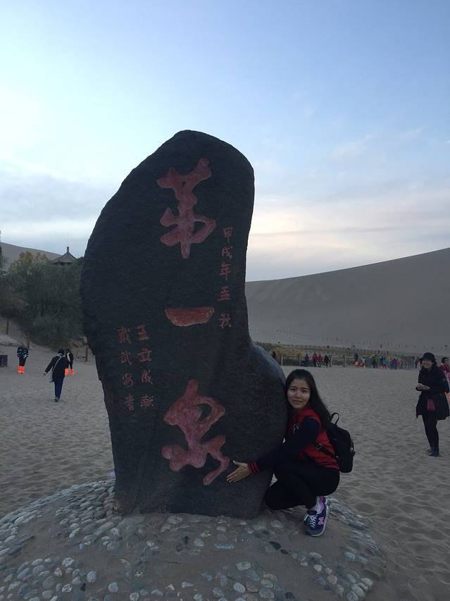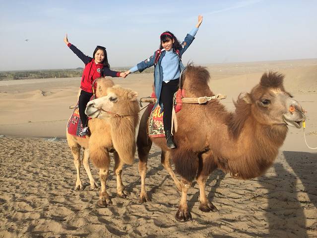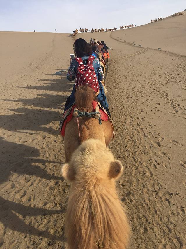 鸣沙山的门票都是三天有效,只要出门的时候在门口录入指纹,第二天可以凭门票指纹入门。我们先去骑了骆驼,100元每人,拍照每人收20元,我看了网友的攻略强烈要求选了一只浅色骆驼,很可爱。