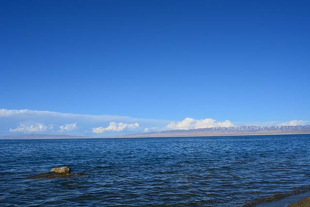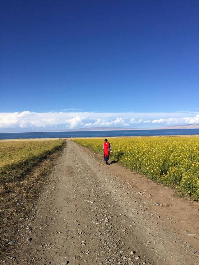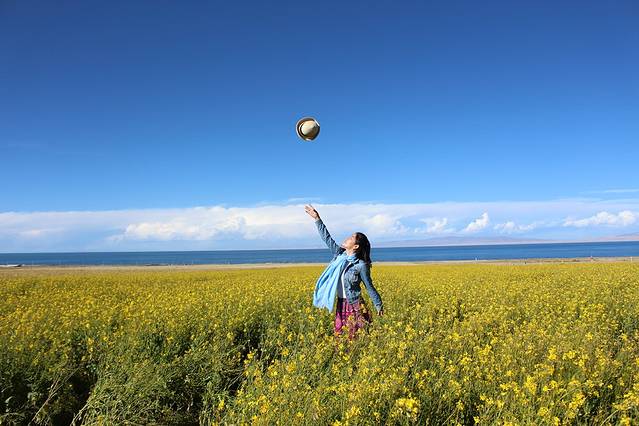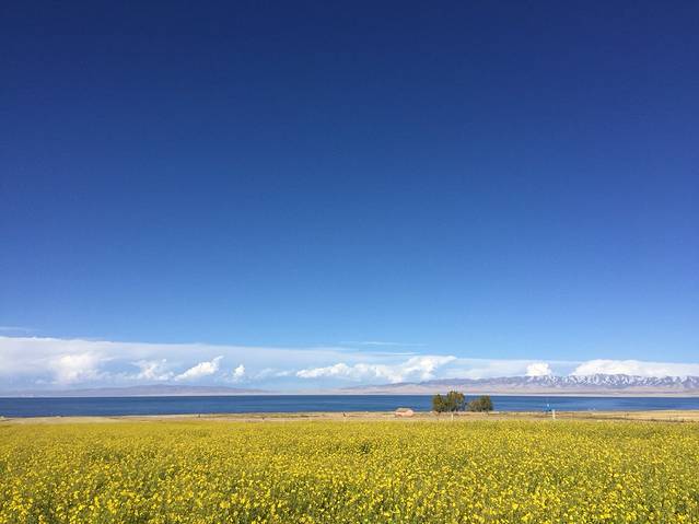 看完雪就向青海湖出发了,离湖还很远的时候,远远看到有一块突出的湛蓝,可以用惊艳来形容,师傅告诉说那就是青海湖了。小伙伴们都隐隐兴奋起来,觉得运气真不赖,在10月下旬还可以看到这么美丽的青海湖。竟然还遇到一块仍在盛放的油菜花田,蓝天,白云,湖泊,花田,交相辉映,美的无法言喻。