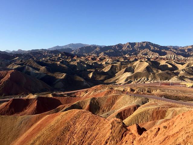 七彩丹霞(门票车票74元)虽然没有网上图片颜色那么鲜艳,也是叫人喜爱的,阳光打下来,非常适合拍照。我们赶时间就只好只去了1,4号景台,4号景台最美,沿途坐景区摆渡车中转的时候,看到了老谋子拍三枪拍案惊奇时搭建的麻子面馆。