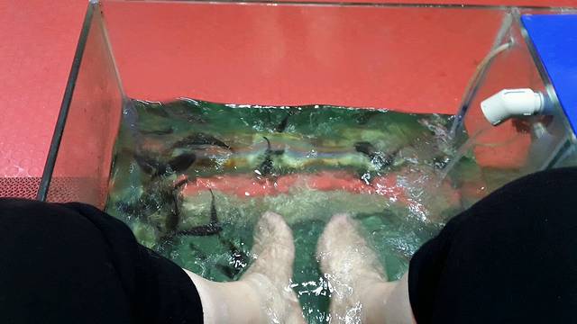 逛累了,可以做个温水鱼疗,小鱼们一直在修剪。旁边有几个大老爷们特别都一下脚就一直在叫唤,因为鱼🐟比较大,所以会有特别痒。