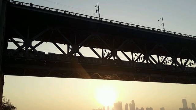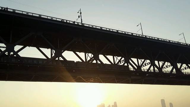 火车🚆穿梭于大桥中央。形成一个汽车,火车,轮船
