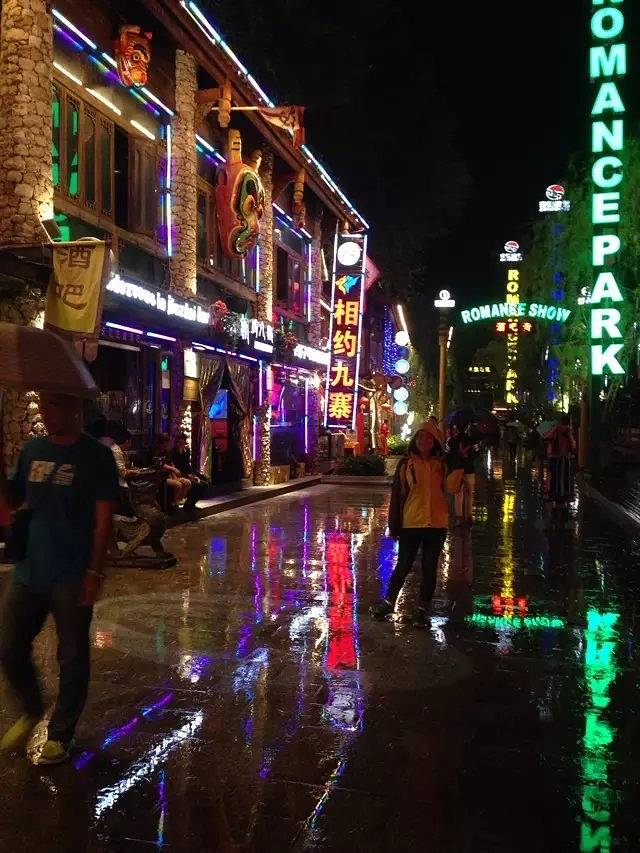 在千古情的右边就是九寨沟最大、最豪华的天源豪生五星级酒店了,左边是就把一条街,看完演出出来再去酒吧喝点小酒也是不错的享受!不过下着雨,看的出来下雨我的防水的冲锋衣就起重要作用咯!