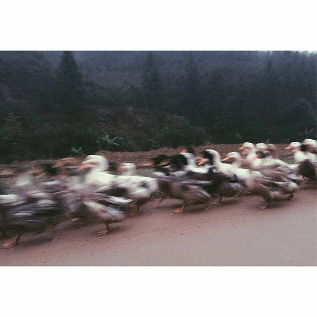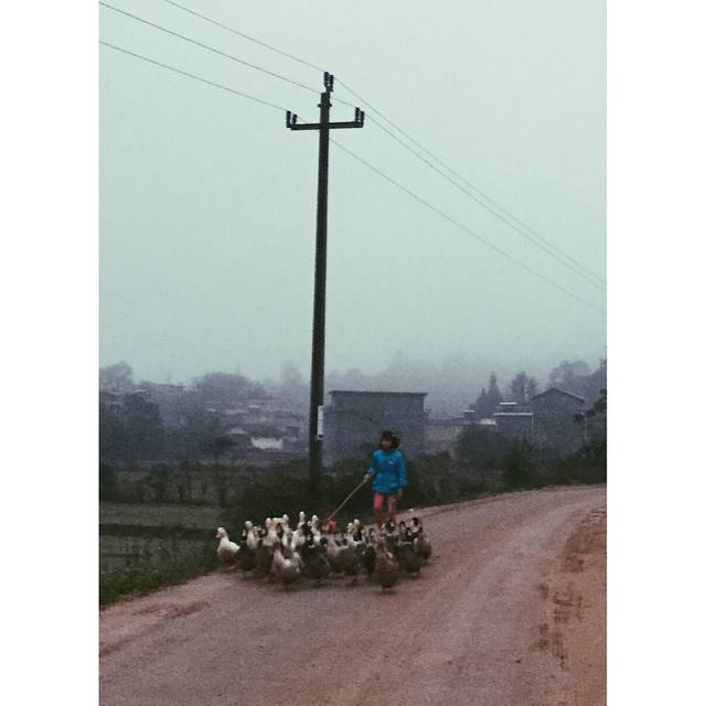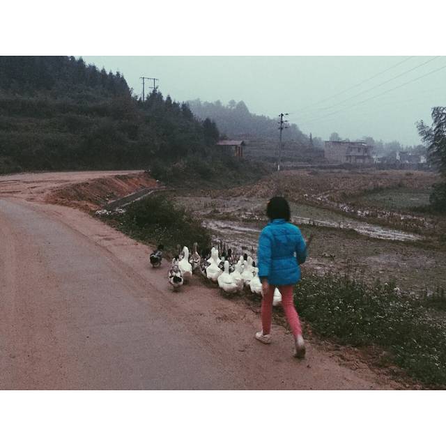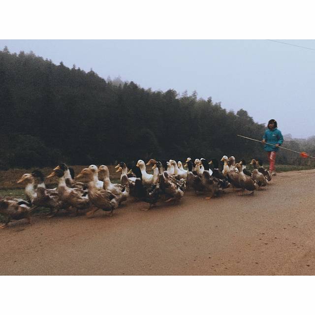 一大早5点多起来,去军营寨看日出,尽管心知道这样的天气是看不到的,而然我们毅然出发,一探究竟。我们住的旅馆其实就在军营寨的山脚,所以我们是走路上的山,用时大概半小时。可能时间尚早,路上鲜有行人,却遇上了一个蓝衣小女孩赶鸭子。