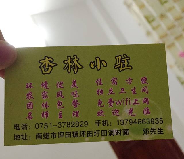 南雄近几年的银杏季旅游业发展得很旺,要去的建议提前订好房间,因为都集中在那几个周末,所以住宿是比较紧张的。我们提早很多就已经订好了,订了比较靠近军营寨的一家店,在村子里没有很好的住宿条件,我就不作推荐了。说一下我住那里,干净还算干净,就是我当时去的时候那里信号不太好,房间的热水不行,要到公卫洗澡。。。不知道现在如何呢,上图一张,有需要的孩纸可以存着。
