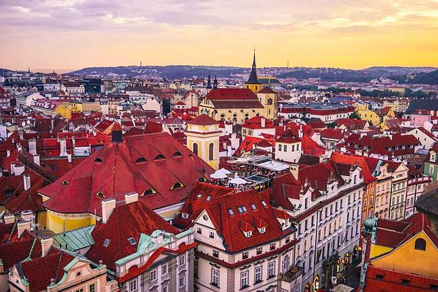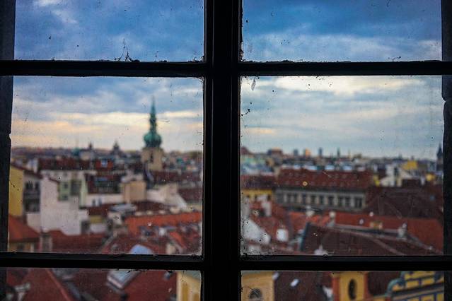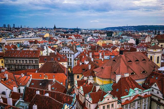 从旋梯拾步而上,从塔顶眺望布拉格的老城。一遍一遍地听着布拉格广场,我没有看见鸽子,我只记得这里的红顶房子。