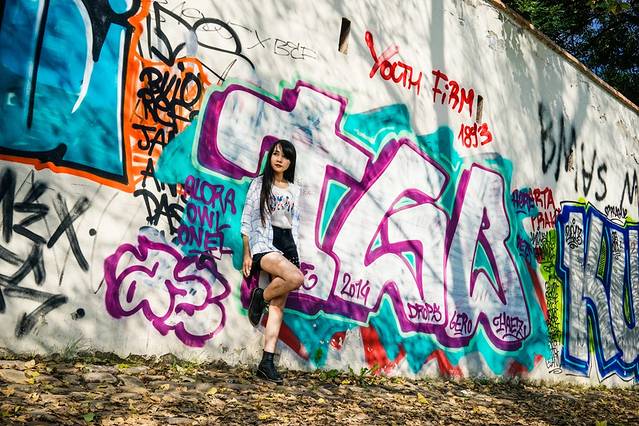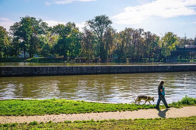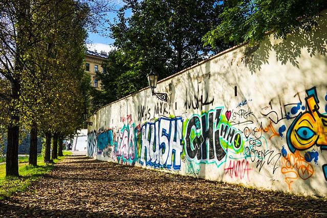 大部分时候我会随意走,不去景点不去闹市,就在离阳光最近的地方闲逛。伏尔塔瓦河边有一面涂鸦墙,来这里散步的,大多是布拉格当地人。