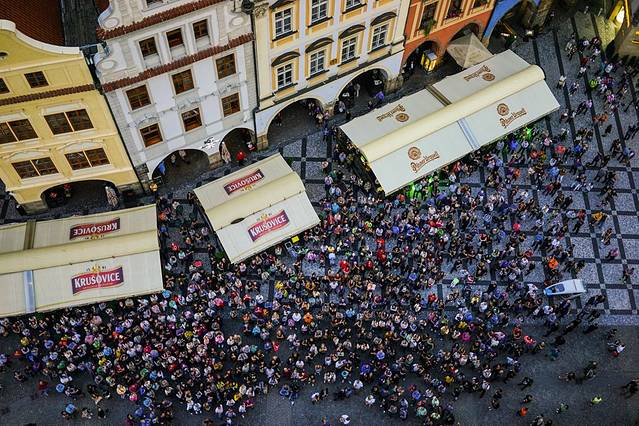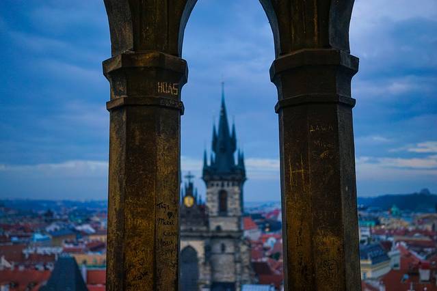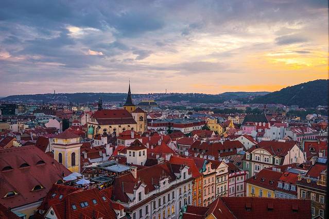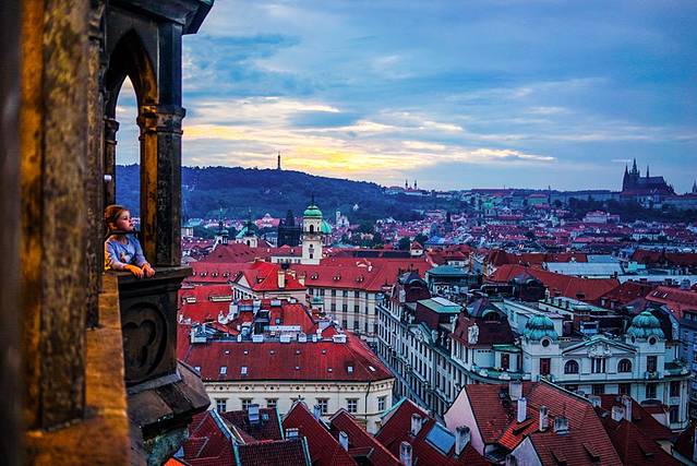 临近黄昏的时分登上天文钟塔。从塔走出观景台的门很小,观景台只能容纳一个半人走。在塔顶走一圈把布拉格360度看完,得有耐心,跟着人流慢慢转。身为一个首都,居然没多少高层建筑,满目的红瓦房子高低起伏。