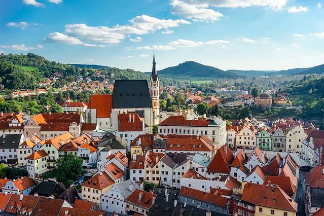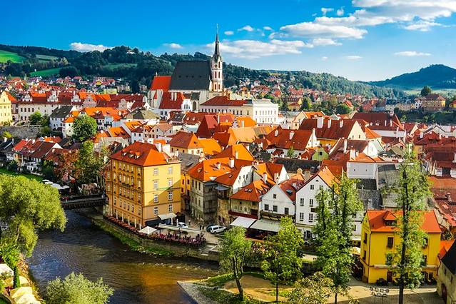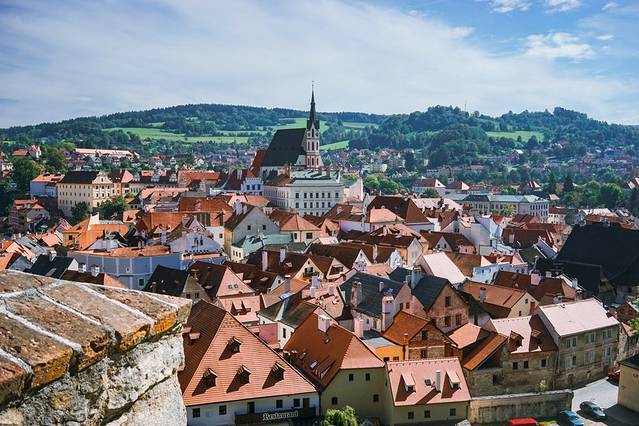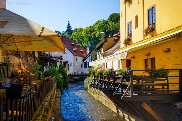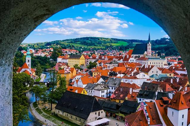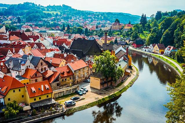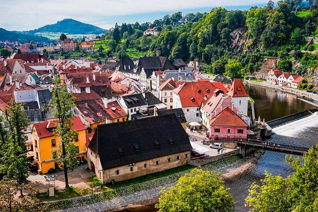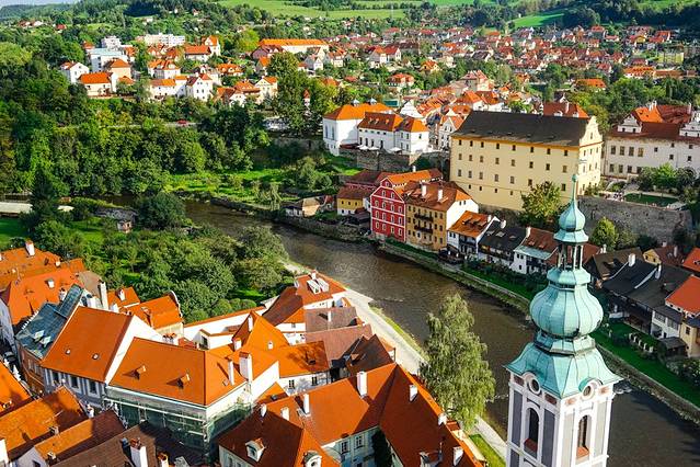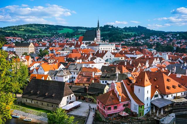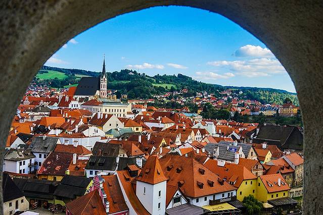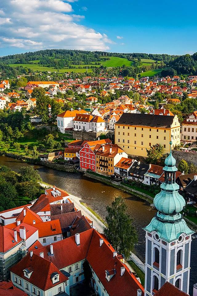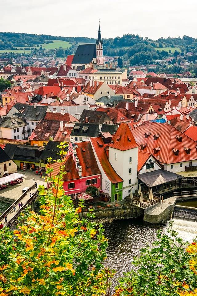 伏尔塔瓦河从小镇流过,蜿蜒的河流把小镇分割开来,于是漂浮在伏尔塔瓦河上的半岛。桥梁连接着这片红屋顶小镇,四周丘陵环抱,初秋把树林的叶子渐渐染黄。
