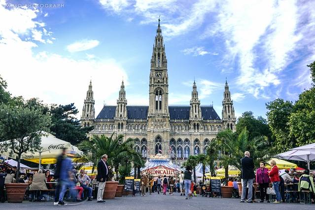 恰巧遇到一个小型嘉年华,在维也纳市政厅广场前,一个临时搭建的小游乐场里传来轻快的乐曲,父母带着孩子在游乐设施里流连,而年轻人和老人则在露天的小集市里,品着芳香馥郁的红酒、吃着松软可口的点心,漫不经心地享受着时间。