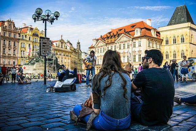 来到布拉格的时候正遇上连续的阴天,乌云密布的天空却丝毫不影响老城广场的热闹。在布拉格广场中心古老的石板上,每天都可以看到都有流浪歌手在演唱,灵活的手指在电子琴键上跳跃,低沉性感的嗓音通过麦克风从音响里传开,吸引着路过的捷克青年、旅人席地而坐,在每一首曲子结束后都欢呼拍掌,俨如一场小型演唱会。