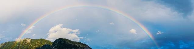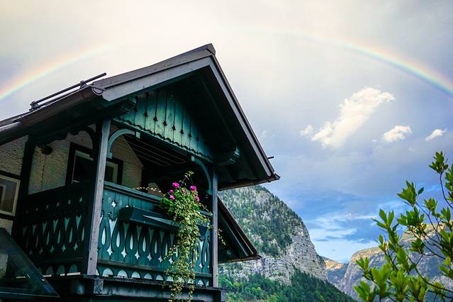 前方一条彩虹悬挂与山间,我兴奋地哇了一声,引来周遭乘客们的眼光,眼神中表现出了“这孩子估计乡下来的,彩虹也没见过的样子”,嗯,大概就是这意思。这时坐在旁边的慈祥大妈指着彩虹的方向告诉我,呐,那里就是哈尔斯塔特。