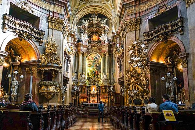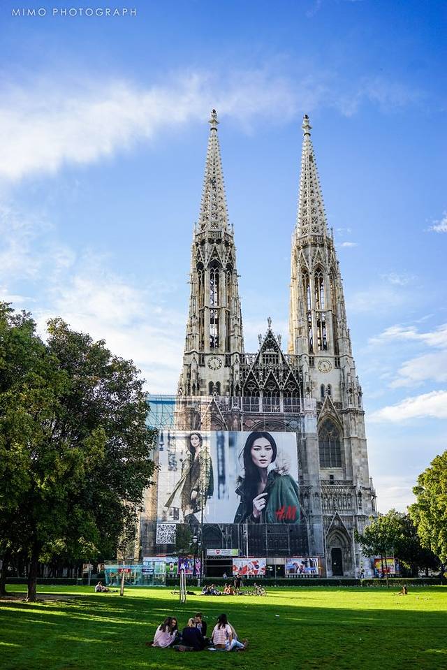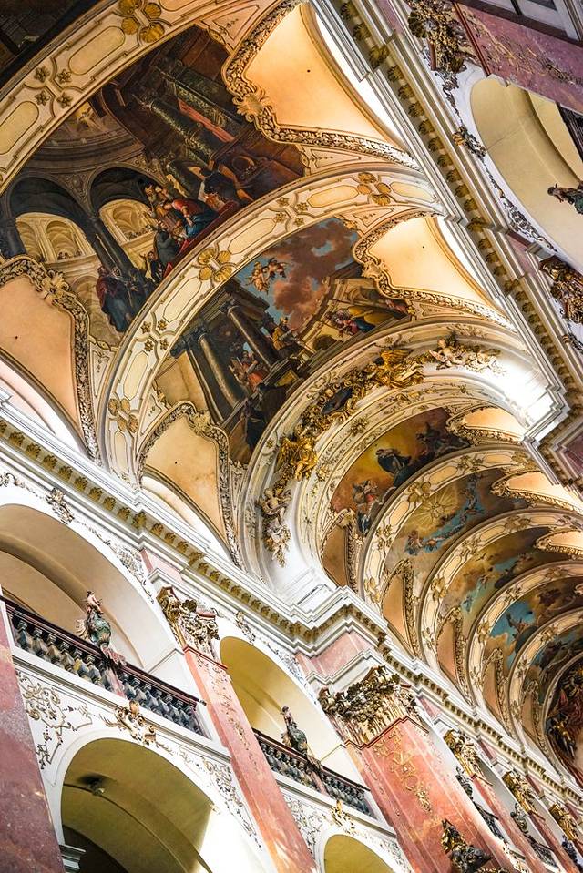 教堂的正面是古希腊神庙风格,两个边厢采用的是意大利文艺复兴的风格。其穹顶和两侧刻有浅浮雕的圆柱格外吸引人。教堂内部装饰华丽庄严,穹顶的宗教壁画十分逼真,可以坐电梯登上穹顶,近距离瞻观华美的穹顶壁画。卡尔教堂门口有一个很大的喷水池,水池旁边是个公园,晚上很多大叔大妈在这里跳舞。曲风是优雅的华尔兹,欧洲人修长的腿划出美丽的弧线,有一晚在金色大厅听完演奏,我和新认识的小伙伴就坐在公园里看着他们跳舞。