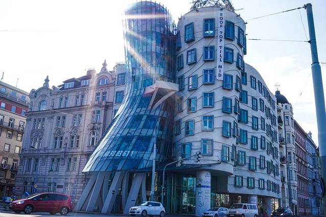 Dancing House是由加拿大知名建筑师法兰克·盖瑞,与捷克建筑师弗拉多·米卢尼克合作设计的。房子造型充满曲线韵律,蜿延扭转的双塔就像是两个人相拥而舞,因此被称为“跳舞的房子”—左边是玻璃帷幔外观的“女舞者”,上窄下宽像舞裙的样子,右边圆柱状的则是“男舞者”,所以又有人以著名的双人舞者金姬·罗杰斯及弗雷德·阿斯泰尔将大楼命名为“金姬和弗雷德”,两栋建筑物像极了他们舞影婆娑的
