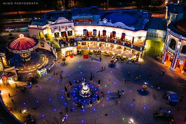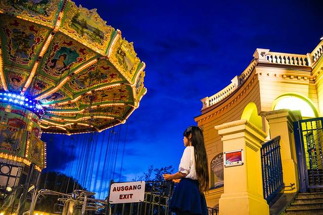 傍晚时份,在普拉特游乐场里,坐上建造于1897年、世界上最古老的摩天轮俯瞰流光溢彩的维也纳市区。