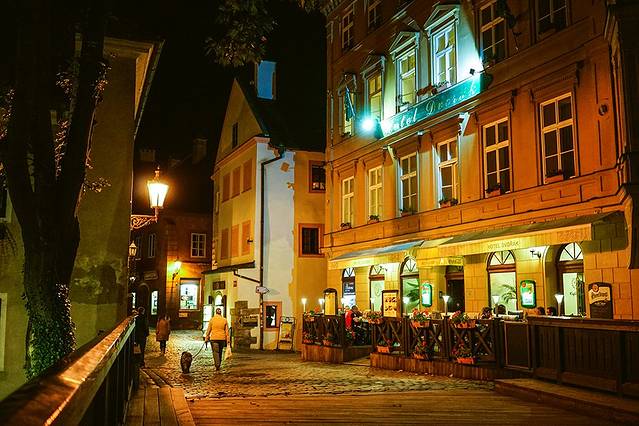 克鲁姆洛夫到处都有各种各样的中世纪风格的小餐馆。餐馆里以深色木制家具而出名,以特色火烤肉类而爆满。傍晚在河边选一家心水的餐厅就餐,点上一份新鲜的鳟鱼和尝尝克鲁姆洛夫独特的杏仁蜂蜜酒,听着优美的音乐,看着美丽的伏尔塔瓦河被日落一点一点染上颜色,这样的晚餐值得浪费两三小时去享受。