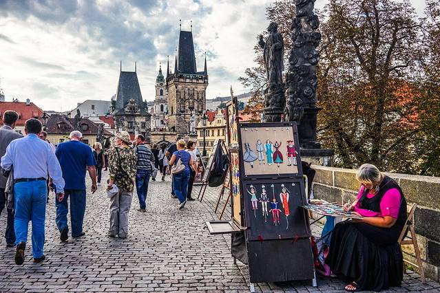 桥上最多的还是画家摆的摊子。一路走过去,各种人像画风都有,每张的价格不便宜,而且生意看起来很好的样子。我承认我有那么几分钟想过要黑在捷克,在街头帮人画人像画发财致富好了。