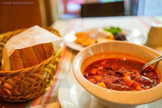 牛肉汤在菜单是叫Goulash,这就是我想要的味道,Goulash的口味我觉得很贴近亚洲菜,怪不得说匈牙利人源自匈奴,从菜肴上看也离欧洲的风格有很大差距。Goulash味道的特别,汤里有土豆、番茄,还加了本国产的辣椒!