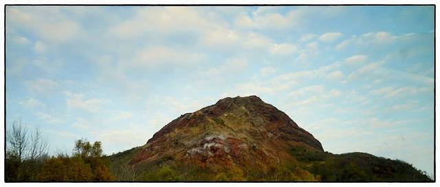大概又过了1小时的车程,我们可以眺望到著名的昭和新山,传说此山为昭和初年所爆发的活火山,故而得名。原本山的高度只有270米,后来因为地壳不断地活动,山的高度日益增加,现在标高402米。至今它仍是一座正在成长的“新山”,且被归类为世界上罕见的岩塔型火山,在红褐色的山脉中仍能见到地热白烟喷出。我们在车上就能闻到臭臭的硫磺味