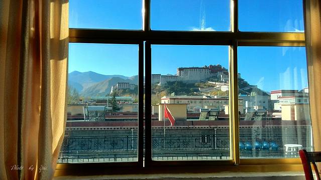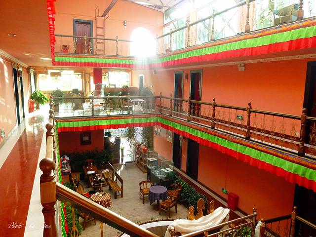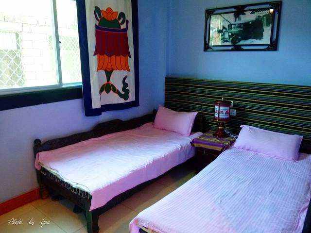 之后,我、阿静和小官到达事先预定好的客栈——拉萨在云端陌上花开客栈(花开店),这家是我们在西藏住过的最好的客栈,我们预定了3个豪华四人间床位房,如我们所料,老板很好人,说有空房,所以给我和阿静双人间,小官大床间,都有独立卫浴。