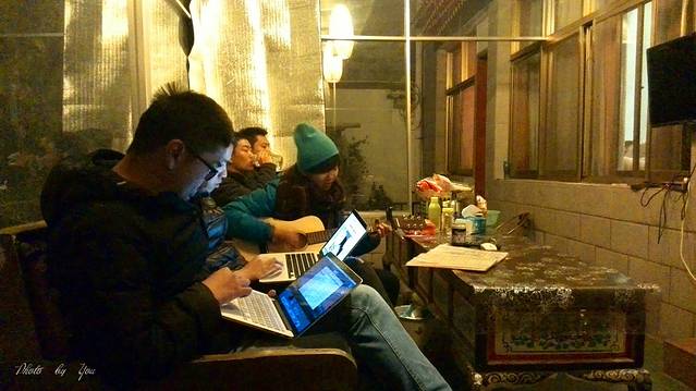 我们放好东西也到院子里凑热闹,其中一个深圳的女大学生还现场弹吉他唱歌给我们听,她平时在外面唱一小时收250元,现在免费给我们唱,棒棒哒!很惊讶于她的肺活量,在西藏我说句话都很吃力,她居然唱邓紫棋的《泡沫》!